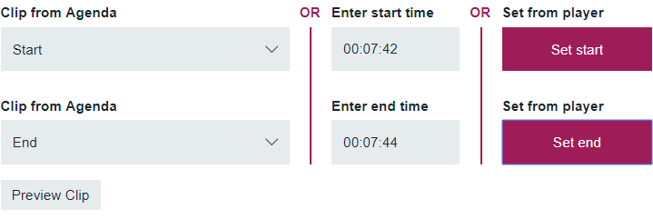 Set from player: you can scroll or ‘scrub’ to a point in a live or archived video, and by clicking on the ‘Set start’ button you’ll start your clip. When you’ve reached the end point of your clip, just click ‘Set end’.